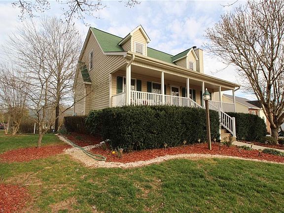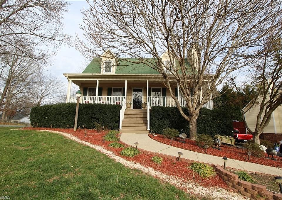 Beautiful Cape Cod with rocking chair front porch. Livingroom has a fireplace with gas logs, LARGE kitchen with extra 6 ft of cabinets w/6 ft bar. Master has walkin closet with dble vanity in bathroom. Main level laundryroom, Two LARGE bedrooms upstairs with walk in closets. Lots of ceiling fans throughout the home. Dble Garage in bsement. LARGE back deck with beautiful landscaping. Close to I-40, 20 minutes to W-S or Gboro. Den with 234 sq ft. not permitted. Come see it Today!!