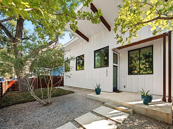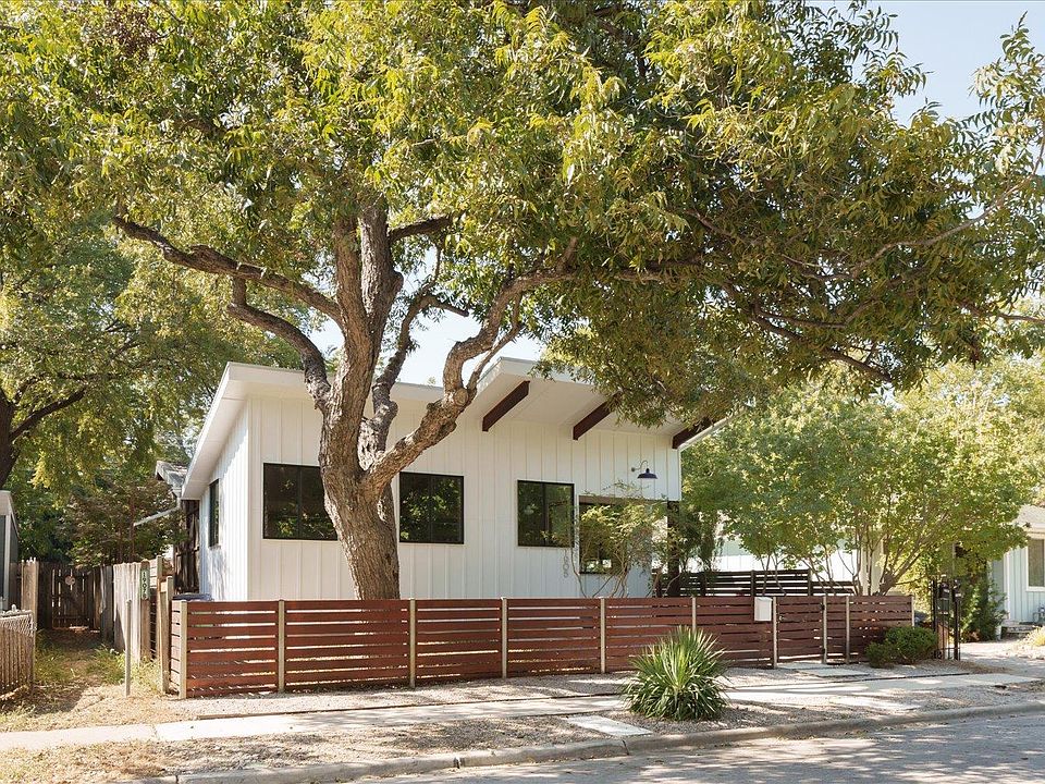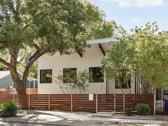 Architecturally Stunning Modern Sanctuary in Holly! Discover an unforgettable living experience in the highly sought-after East Austin neighborhood with this captivating 2 bed, 2 bath home. Soaring ceilings, custom design, and abundant natural light create a seamless blend of organic materials and clean, modern lines. Inside, find dramatic vaulted ceilings with exposed wood beams, rich dark wood floors, elegant schoolhouse lighting fixtures, and Hunter Douglas double-pane windows and coverings. Off the entry, warm wood shelving that wraps the walls provides a stunning space for any collection. The heart of the home is a truly memorable kitchen with stunning teal blue custom cabinetry (all soft-close!) set against classic dimensional subway tile. The chef-grade appliances include a Blue Star 4-burner gas range with griddle, and wok-ready high flame capability, perfect for culinary adventures and a gorgeous rustic sliding barn door separates the kitchen from the living area. The Owner's Retreat is a serene sanctuary designed for true relaxation. Its en-suite bath is a lavish oasis featuring a striking blue mosaic accent wall and a spacious, glass-enclosed walk-in shower with modern, high-end fixtures. Step outside to the incredible screened-in porch, a seamless outdoor extension of your living space. Perfect for al fresco dining and relaxing. Beyond the porch, the yard is a gardener's dream, featuring raised garden beds and beautiful Cherry Laurel trees thoughtfully lined along the fence for enhanced privacy. Experience the quintessential Austin lifestyle. This home delivers urban convenience by placing you steps from some of the city's most beloved local eateries and cultural hot spots. You're just a short stroll to Lady Bird Lake's miles of hike and bike trails and minutes from the excitement of downtown. More than a residence, this property is a rare lifestyle opportunity in one of Austin's most sought-after locations—a home you simply must see!
