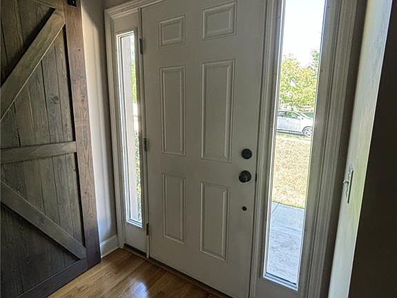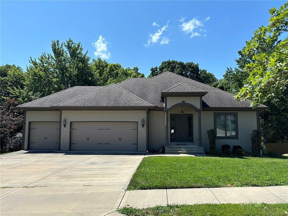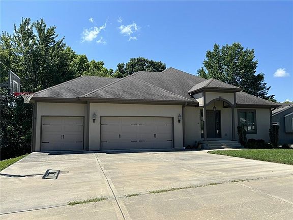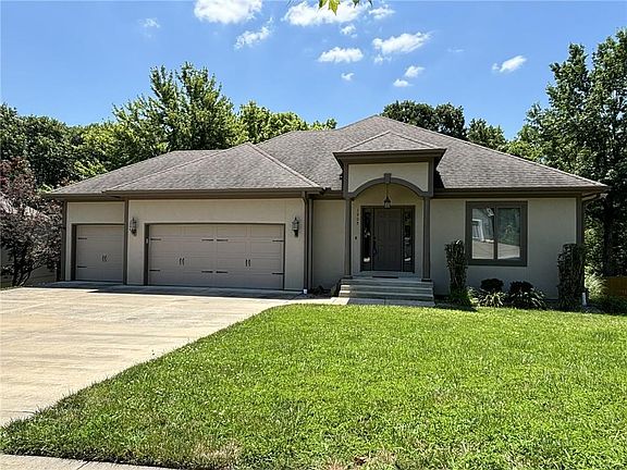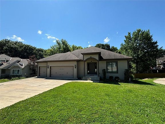 Discover the epitome of open-concept living in this 12-year-old reverse 1.5-story home, where quality and space blend seamlessly. Upon entering, you'll be captivated by the expansive entryway with beautiful wood floors that lead into the fully open living room, kitchen, and dining rooms. The open atrium staircase allows natural light to flood this fabulous home, enhancing its warm and inviting atmosphere. The living room features a raised, tiered ceiling adorned with large decorator ceiling fan and corner gas log fireplace, creating a welcoming ambiance perfect for relaxation and gatherings. The kitchen, the heart of this home, includes large dining island, abundant cabinetry for all your storage needs, granite countertops, and a convenient pantry, making it a chef's delight. The primary suite is a true retreat, offering a private covered deck and a spacious bathroom with a dual sink vanity, a soaking tub, a shower, and a walk-in closet, providing a luxurious and private space for unwinding. A 2nd bedroom is also located on this floor, ideal for use as an office for those who work from home. Venture down the open atrium staircase, where you'll be taken aback by the vast open family room, complete with a built-in bar featuring granite countertops, a wet sink, and cabinetry. This space is perfect for entertaining or enjoying a casual night in, with ample room for watching the Chiefs. This level also includes two additional bedrooms, a full bathroom, and large storage room that doubles as the furnace room, ensuring plenty of space for all your storage needs. The outdoor space is just as impressive, featuring a deck overlooking a private backyard surrounded by thick woods, offering a serene and picturesque setting. Topping off this masterpiece is a 3-car attached garage, providing ample room for vehicles. Embrace the blend of elegance and functionality in this remarkable home. Schedule your visit today to experience its undeniable quality and spacious design firsthand!