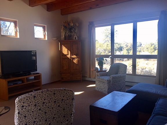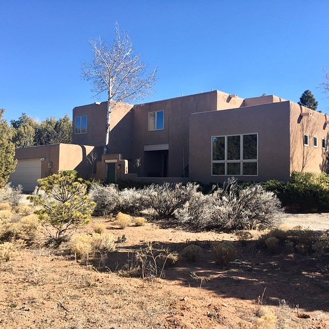 This Sun Mountain offering next to Museum Hill is located on approximately 3/4 of an acre on a quiet cul-de-sac. The 2 story, 2,916+/- square foot home has an entry courtyard, separate fenced in hot tub area & a large, private brick patio. The living room has a kiva fireplace with high beamed ceilings & large south facing windows for passive solar heat in the winter. The spacious family room also has the same high ceilings with beams with large windows & French doors opening into the hot tub area. This light & bright home's kitchen is open to the dining area, a separate sitting area & has a walk-in pantry. The two upstairs bedrooms each have their own full baths & one bedroom has a West facing portal.