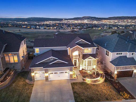 VIEWS and more VIEWS! Breathtaking Mountain, City and Golf Course Views! This Red Hawk Golf community is a rare find. This home features 5 bedrooms (one being Main floor master) and 4 bathrooms plus a huge loft. Appx 3800 sq ft with an additional 2150 in the unfinished basement. The driveway is south facing *HUGE plus* living in Colorado, and sits on a quiet cul-de-sac. As you enter you notice the expansive hardwood on main level with vaulted ceilings and the "money shots" of the gorgeous views through every window. Kitchen offers slab granite, white cabinets, stainless steel appliances, a breakfast nook and counter with an extra pantry for additional storage space. The master suite boasts the same gorgeous views with a spacious, 5 piece master ensuite bath. The main floor also has a newly remodeled laundry room and powder room. The layout is an entertainers dream -flows from kitchen to family room perfect for watching the big game from all areas. Completely new office on main level- new paint, new lighting, and new modern french double doors. Upstairs offers a huge loft great for entertaining/movie and game area with new lighting. There are 4 bedrooms upstairs along with 2 full bathrooms. Tons of love, attention (and money) has been put into this beauty; New interior paint throughout the house in 2020. Built in garage shelving , 4 new ceiling fans and new exterior house lighting in 2021. New electrical subpanel and additional outlets installed in garage and new concrete landscape curbing in backyard also installed in 2021. New front landscape wall with built in sprinklers, drainage and low volt lighting in 2022, . Refinished wood flooring 2023. New exterior paint and new garage doors with new garage door openers that have WiFI and security cameras in 2023. LOW tax rate. Easy I-25 access and close to downtown Castle Rock, The Promenade and Outlets. Appx 35 minutes to downtown. Like the song says, "Who Could Ask For Anything More?"...
