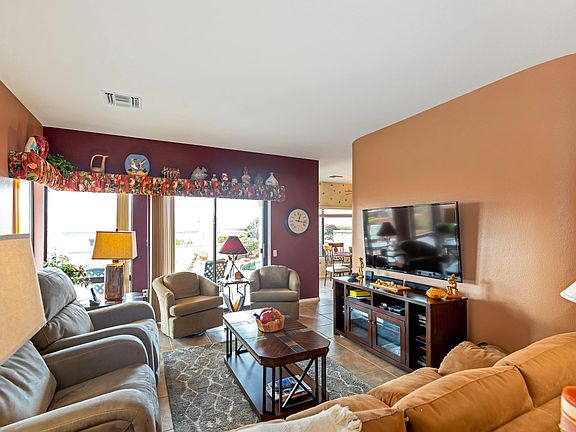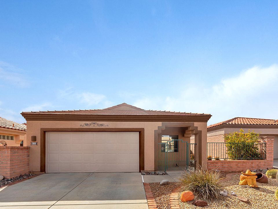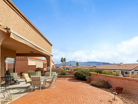 Warm & classy describe this home. A totally remodeled kitchen boasts rich knotty alder cabinets with all the bell & whistles. Thick beautiful granite, stainless appliances & a pantry wall with pull-outs too! A professionally coordinated paint scheme throughout the home compliments the large tiles and low pile carpeted bedrooms. And a mural painted by a local artist highlights the dining room. Lots of extras are included in this plan such as a 1/2 bath and a large laundry room with cabinets and utility sink. The 2 car garage offers extra work space with a big window & storage cabinets. A large covered patio can be enlarged by the remote controlled sunshade. And the remote controlled screen allows full enjoyment of the impressive Santa Rita Mountain VIEWS!