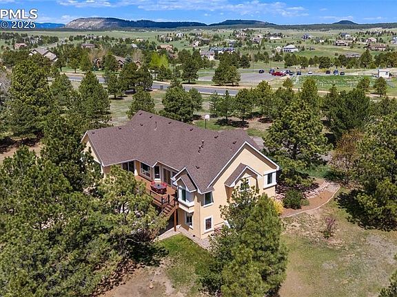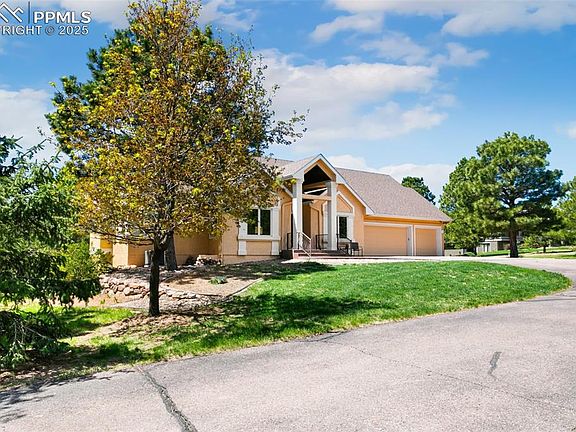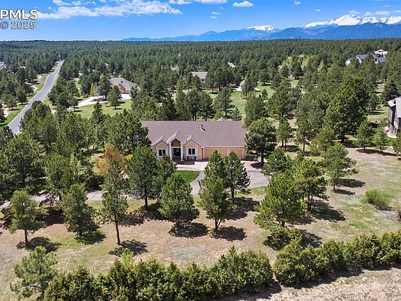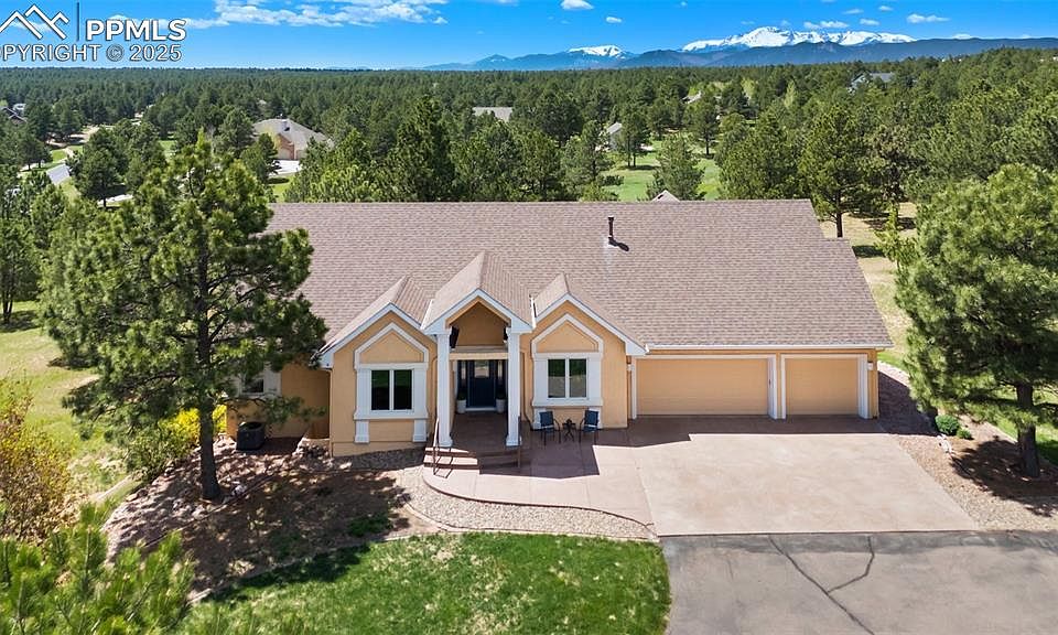 Nestled in a prestigious golf course community, this luxurious 6-bedroom ranch-style home seamlessly blends elegance, comfort, and functionality. Perfectly situated on a serene, treed lot, it offers breathtaking, unobstructed views of Pikes Peak from the new composite deck—ideal for both relaxing and entertaining. This rare and thoughtfully designed floorplan features 3 spacious bedrooms and a dedicated office on the main level, complemented by rich hardwood floors and an abundance of natural light streaming through all-new Marvin Infinity windows (installed in 2019). The expansive open-concept living areas create a warm and inviting atmosphere, perfect for gatherings or quiet evenings by the fire. The home is built for year-round comfort with central air conditioning, a full-house generator, and gutter heaters for Colorado’s dynamic seasons. A heated 3-car garage and a fully equipped, heated and vented workshop in the basement cater to both hobbyists and professionals alike. Additional highlights include Class IV impact-resistant shingles for added protection and valuable additional water rights, offering peace of mind and enhanced flexibility. This is more than a home—it’s a rare opportunity to own a high-quality, low-maintenance retreat in one of the region’s most desirable communities. Experience mountain-view living with all the modern luxuries and practical features you've been searching for. Don't miss the walk-through video tour or seller brag sheet in additional provisions. These sellers have thought of it all!