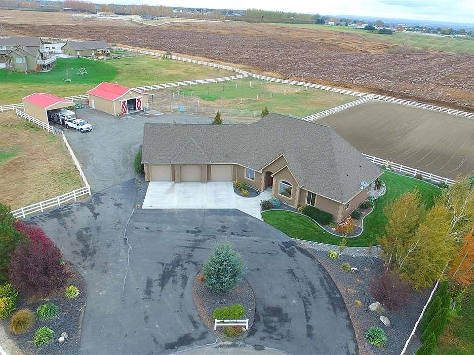 Welcome to 190518 E. Game Farm Road, exceptionally maintained horse property located on a crest with territorial views. This custom home and barn were built with ease of maintenance in mind for more time on your horses and less time working outside. You will be greeted in the foyer with raised ceilings, and maple hand scraped flooring with inlay. The kitchen opens to the great room and has stainless appliances including refrigerator, slide in convection oven with glass top, vent hood, warming drawer, dishwasher and trash compactor. The great room has large windows, custom blinds, a 55" JVC flat screen, built in shelving and propane gas fireplace. The owner`s suite is ample in size with exterior access, custom barn door and flat screen tv included. The owner`s bath includes dual sinks, heated tile flooring, garden tub, tile shower, and walk~in closet with custom shelving. Other interior features include while enamel millwork and trim, wooden blinds thru~out, sound reducing double wall between the great room and owner`s suite, media closet hosting the 7.1 surround system with built~in speakers (hdmi hub, blueray and amplifier remain with home). The secondary bedrooms are located on the opposite side of the home from the owner`s suite and are served by a spacious main bath. The laundry and mudroom also house the powder bath for ease of clean up after working outside. The garage is over 1,100sf with Martin roll~up doors and belt drive openers plus extra storage. Exterior features of the home include low maintenance stucco siding, composition shingles on a gorgeous 12x12 pitched roof, wired for hot tub, and Christmas soffit lights with interior switch. On the property is a 3 stall horse barn with tack room, hay storage and plenty of room for your equipment. The stall fronts are Noble with FRP paneling and corner stall feeders. The outside runs have heated self~watering tanks. There is also a round training pen, 4 irrigated paddocks, Noble and vinyl fencing, a 130x160 irrigated laser leveled riding arena, and a 40x20 equipment\hay storage building. The professionally landscaped yard has curbing, underground timed sprinklers, fire pit, propane bbq outlet, water feature, garden area, windbreaks and privacy trees and shrubbery. Buyer to verify schools, KSD just released new boundaries showing Cascade Elementary and Horse Heaven Middle and Kennewick High..