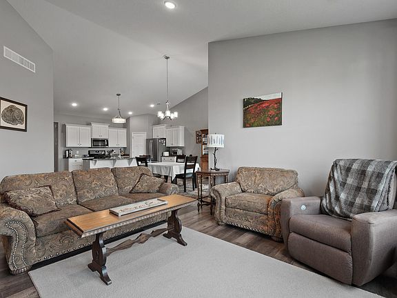 A charming one-level home in an associated detached townhouse community offers convenience and accessibility. It features three spacious bedrooms and two well-appointed bathrooms, including a luxurious primary bathroom with a soaker tub and tile shower. The main-level laundry room eliminates the need for stairs with laundry baskets. The open-concept layout fills the interior with natural light through large windows. The kitchen boasts modern stainless-steel appliances and a granite center island. Both the Master bedroom and great room have vaulted ceilings, creating an airy feel. The great room also showcases a floor-to-ceiling stacked stone gas fireplace for warmth and character. An oversized master closet provides ample storage, and there's additional storage space or workshop potential in the tandem garage. Enjoy the spacious patio and peaceful pond view. This home offers simple living in a beautiful setting, a unique opportunity you won't want to miss!