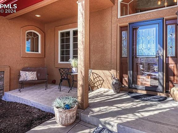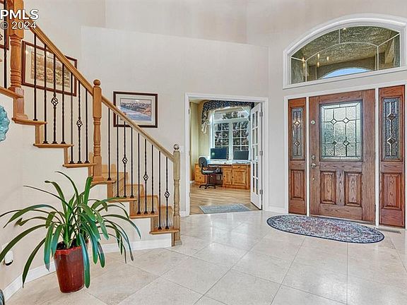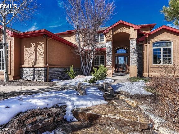 Experience the Rocky Mountains in the King's Deer community. This exquisite 2-story custom home with 6 garage spaces on 2.7 acres, offering vistas of the Front Range & Colorado sunsets. The grand foyer is adorned with travertine tile & a custom curved staircase. Discover tranquility in the main floor office with a built-in oak wall unit & French doors. The great room enchants with 2-story windows, the warmth of natural light, & inspiring views. The gourmet Kitchen boasts an open design, granite counters with 2 islands, cherry cabinets, reverse osmosis system, walk-in pantry, 3-sided gas fireplace, and eating area with double glass doors opening to a partially covered deck. Entertain in the formal dining room with wine bar. Retreat to the main level primary suite with gas fireplace, connecting to the lavish 5 piece bathroom, including a spa tub with lovely views, double-head shower, radiant heat, & elegant tumbled marble and River Rock. Upstairs, endless views on the loft bridge, a junior en-suite & 2 additional spacious bedrooms connected by a Jack & Jill bathroom, all with walk-in closets. The sunny walk-out basement offers a 5th bedroom en-suite, large recreational room, extensive wet bar, versatile workout/theater room, & large unfinished storage space with work bench. The expansive wood deck wraps more than half the home & enjoy the stars while soaking in the 7 person jetted hot tub. The walkout basement leads to a raised-bed garden, large fenced area, and beautiful professionally landscaped yard with over 100 trees & flagstone paths. Invisible fence can be activated for dogs. This home has a newer well pump, 2 leach fields, & additional water rights for purchase. BONUS: heated & finished 3-car detached garage with epoxy floors! Enjoy 6 miles of bike & walking trails, King's Deer Golf Course, playground & fields. Situated in the esteemed D38 School District and easy access to I-25, Hwy 83, and AFA. Make this private home on a cul-de-sac your sanctuary.