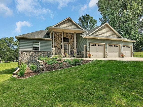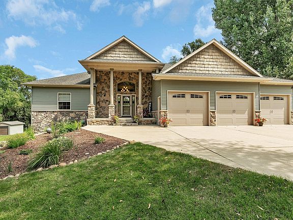 Discover unparalleled luxury in this exquisite executive walkout rambler, perfectly situated on over one acre with convenient and easy access to 2 very clean and connecting lakes. With 3,500 finished square feet, this home seamlessly blends elegance with comfort. Highlighting 4 generous bedrooms, 3 bathrooms, an oversized 3 stall insulated and heated garage along with additional parking space. Step inside and be welcomed by towering 14-foot ceilings in the entry and great room with a striking gas fireplace lined with stone and ample lighting. The Brazilian cherry hardwood floors lead to a chefs dream kitchen offering granite countertops, custom maple cabinets, stainless appliances, walk-in pantry and ample cupboard storage space. Step out onto the maintenance free deck along with screened porch to take in the views of the large backyard and Long Lake. The primary ensuite features a private maintenance free deck, tray vaulted ceilings, accent lighting, a large walk-in closet and a private bathroom that is sure to impress with a large walk-in tile shower, jetted tub and dual sinks. Downstairs is set up perfectly for entertaining or hosting holidays with a large family room that walks out to a huge patio, an inviting wet bar with granite tops, a wine cellar, along with 3 spacious bedrooms all with the comfort of in-floor heat. Enjoy plush green grass with the in-ground sprinklers fed from the lake with the direct easement access to Long Lake offering a sandy beach area to relax by the water. The nearly new dock and boat lift are negotiable. This home provides the ultimate lakeside living experience, combining modern amenities with natural beauty, making it an ideal retreat for those who appreciate both style and functionality.