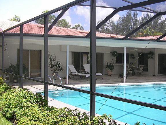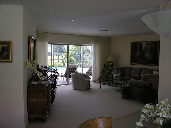 3 BR / 2BA / 2-car garage, unfurnished lakefront pool home with open floor plan on large lot in beautiful quiet gated community. Enjoy water views from the living room, kitchen, great room & MBR, which all face the lanai, largest private pool in the community, private back yard, Ceramic tile floors and neutral carpet throughout. Kitchen with center island, breakfast nook, white cabinetry and walk-in pantry. Separate dining room with large window. Separate large airy great room with built-in cabinetry and high vaulted ceiling. MBR features room for king-sized bed and has walk-in closet with built-ins. Ceiling fans in bedrooms and family room. Oversized sliding glass doors from the great room, living room & MBR lead to the lanai and 32'x20' pool overlooking the lake. Expansive screened lanai has large covered sitting & eating areas with ceiling fans & pass-through to the kitchen. Laundry room has built in cabinetry, laundry tub, washer/dryer & access to oversized 2-car garage with cabinets, tool storage area & pull-down attic stairs to additional storage. Superbly maintained & meticulously landscaped. Cable TV service, pool, lawn and landscaping maintenance provided. Neighborhood Description quiet, gated community