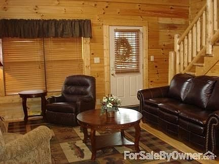 Beautiful 2 story log cabin in the Covered Bridge Resort in Pigeon Forge TN. Only 2.3 miles to the main strip. Great location off of Wears Valley Road. Only 1 1/2 miles from the New Sports Complex!! This cabin would be a great second home or a fantastic Rental Property! As you enter the Great Room you are greated by a Stacked Stone Fireplace with a large hand hewn mantel. The ceiling boasts large beams as well as a large hand peeled log across the loft. All wood interior. The Great Room and Kitchen are all solid oak floors.All stainless steel appliances !! Luxury Leather Queen Sleeper and recliner along with a 42" Flat Scren TV with Blu-Ray DVD player. Wi-Fi has been installed! The main floor has a large Jacuzzi Tub including a full bath with shower. As you climb the stairs you will see the large loft complete with a 48" Flat screen TV with Blu-Ray DVD perfect for a pool table or Sports Room! The second floor also has a full bath with tub shower. Both King Size beds are draped with hand-made Donna Sharp Quilts! On the back porch you will find rockers to relax you time away as well as a 5 person Hot tub! The resort offers a large pool as well as a large covered picnic area. WOW ..what a find....Additional property info: http://www.forsalebyowner.com/listing/2-bed-Log-Cabin-Home-for-sale-by-owner-1906-Creek-Overlook-Way-37862/23933875?provider_id=28079