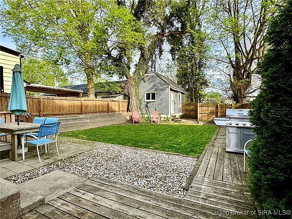 This rare 2 bed, 1.5 bath home in the heart of New Albany offers the perfect mix of character, comfort, and community. Located on the sought-after 1900 block of Ekin Avenue, it features a wide front porch with a swing, overlooking blooming phlox and the original concrete retaining wall. The real wood siding maintains its historic charm, and the roof and dormers were replaced less than two years ago. Inside, tall ceilings, original hardwood floors, transom windows, and classic trim showcase the home's vintage appeal. The living and dining rooms include window nooks ideal for reading or storage, and a decorative fireplace adds a welcoming focal point. The kitchen is bright and efficient, opening directly to the backyard for easy indoor-outdoor flow. A main-floor bonus room offers flexibility as an office, nursery, or creative space. Upstairs, the vaulted primary bedroom features exposed beams for added charm. The unfinished, waterproofed basement provides clean, usable storage, while a two-story garage or shed adds even more space. The private fenced yard includes three gated entries, a patio perfect for outdoor gatherings, and a 20-foot raised garden bed prepped with organic materials. Walk to nearby schools, restaurants, and the Ohio River Greenway. This is a special opportunity to own a home full of charm in a tight-knit neighborhood.