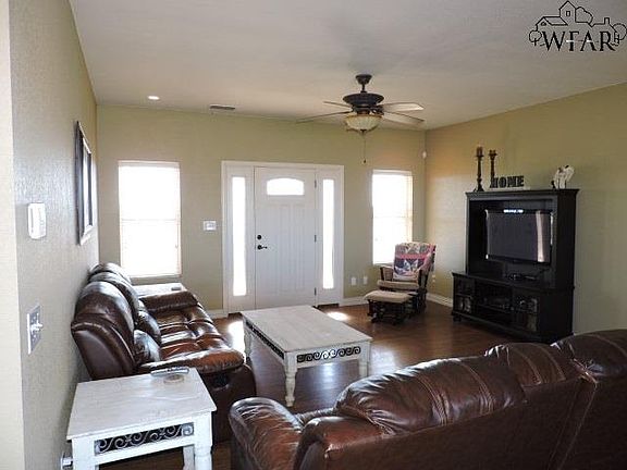 This marvelous home rests on 2 acres atop a bluff overlooking the North Texas countryside and the Wichita Mountains. This home is equipped with a storm room, a new roof, a large enclosed yard, an open floor plan perfect for entertaining, a large kitchen with a center island, a fireplace, and an extra room upstairs that could be converted to a fourth bedroom.This home features the peace and quiet of country living coupled with the convenience of proximity.