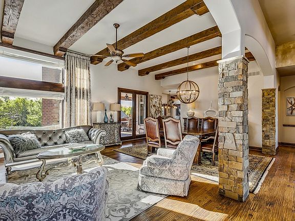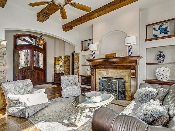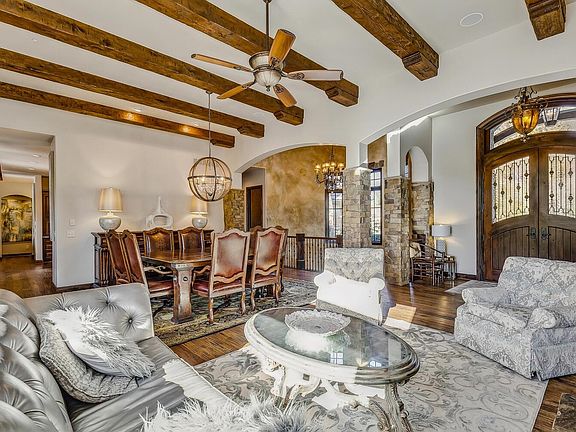 Fantastic estate home located on a wooded 2+ acre lot in the gated community at the Reserve at Reed's Cove. Built by Ritchie Building Company, this home not only has a stately exterior, but is loaded with amenities! Every aspect of this home displays high levels of detail and customized craftsmanship! Professional landscaping, circle drive and a porte cochere greet you to the entry with custom iron doors and a courtyard with a fireplace. Interior highlights include: a dramatic turret staircase to the lower level, scraped wood flooring that carries throughout the main floor & a large living room/dining room appointed with wood beamed ceilings and a fireplace. Wrapped in light, the heart of this home lies in the large family room that is anchored by a stone fireplace and magnificent wood vaulted beamed ceilings. Adjoining the family room is an amazing chef's kitchen with outstanding amenities: 4 burner gas range, 2 dishwashers, pot filler, ice maker, double ovens, huge center island, granite counter tops, range hood, built-in refrigerator, breakfast nook, walk-in pantry & wood flooring. The elegant master suite offers a beautiful custom beamed ceiling, access to the adjacent library with built-ins & a spa-like bathroom with his/her vanities, walk-in tile shower and a huge closet with built-in dressers and an island. 2 additional bedrooms with wood floors, walk-in closets & Jack & Jill bath between can also be found on the main floor. A powder bath & a spacious laundry complete the main level. Spectacular finishes continue in the lower level of this home. Huge true level walk out lower level displays areas for living and entertaining. Features include: restaurant size wet bar with all appliances, rec room with the 6th fireplace, theater room (all theater equipment stays-chairs are for sale), game room, exercise room, desk area, 3 bedrooms (all with walk-in closets), full bath & another power bath. No detail has been overlooked...wonderful cabinetry, stone columns, solid doors, great light fixtures & beautiful beams!!!! Enjoy the backyard dreamscape with vista views of the trees, lush backyard with sprinkler system (lot goes beyond iron fence), stone surrounded in-ground heated salt water pool with baja-deck, slide, fountains, auto cover (new Oct. '22) & diving board, pool house with a bathroom, outdoor shower and built-in grill, separate large fire pit, lighted sport court, playground, hot tub & a covered stone deck with fireplace. For the car lovers, this home has a 7 car garage...3+ attached, 3 car detached w/ heat, bath & another 1 car detached all around a spectacular motor court. Too many wonderful amenities to name, this home is a must see!