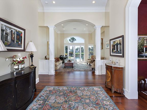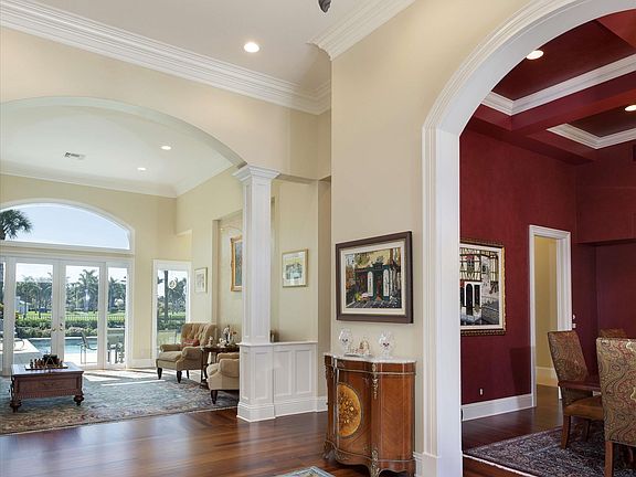 Fabulous fairway views focus on a lake on the Jack Nicklaus Signature Golf Course from this beautifully livable custom-built residence in Royal Palm Yacht & Country Club.On Royal Palms magnificent golf course, a signature design by the legendary Jack Nicklaus, this beautiful custom-built estate gives a sweeping southeasterly vista that centers on a picturesque lake amid the 18th and 9th fairways. Effortless livability is a key element of this traditional-style single-story residence that flows in a well-laid-out floor-plan opening to the courtyard-like pool patio and lush golf course vista.View-filled French doors brighten the comfortable living room and gourmet kitchen, leading out by the sparkling pool. Designed for easy entertaining, the open family room is served by a wet bar and joins through a window wall to the poolside loggia with summer kitchen. Four privately arranged bedrooms feature a large master suite that opens to the pool patio from both the bedroom and adjoining office/sitting room. Situated close to the luxurious golf clubhouse of Royal Palm, this choice fairway estate offers gracious living in Boca Ratons exclusive signature address.LocationThatch Palm Drive, Boca Raton, Florida. Known as one of South Floridas finest private club communities for more than half a century, prestigious Royal Palm Yacht & Country Club offers guard-gated seclusion in a premier location across from the landmark Boca Raton Resort & Club and the Atlantic Ocean beachfront. Mizner Parks world-class shopping and dining are close at hand, and Boca Ratons private executive airport is only a 15-minute drive.PropertyEmerald fairways and a scenic lake provide the backdrop for this beautiful traditional-style estate giving a spectacular southeasterly view from manicured landscaped grounds with privacy hedges on both sides. Airy French doors open the residence to the relaxing outdoor living space featuring a sun-splashed pool patio and a loggia outfitted with a summer kitchen.ResidenceCustom built in 2003, this comfortably livable residence is designed in single-level floor-plan of 4,322 total square feet with four bedrooms, three full and two half baths, and a side-entry two-bay garage with additional golf cart storage. The high ceilings are set off by crown moldings. Floors are finished in fine hardwood and marble, and all windows and exterior doors are fitted with impact-rated glass. Amenities include zoned climate-control systems and a back-up generator.Stepping in from the inviting covered entry, the hardwood-floored foyer opens through a wide, pillar-framed archway into the light-flooded living room, bringing in views of the pool and golf course through a transomed window wall with French doors to the patio. The formal powder room is off the foyer. Through another archway, the formal dining room is appointed with tray ceiling treatments and a recessed buffet niche. Bright French doors lead to the pool patio from the gourmet kitchen equipped with crisp white cabinetry, granite counters, and high-end appliances including an induction range. Separated by a breakfast bar, the marble-floored family room opens its doors to the poolside loggia and is served by a furniture-style built-in wet bar with under-counter refrigerator and wine cooler. In another wing, the master suite opens to the pool patio and golf course view from the spacious bedroom and adjoining office/sitting room with custom built-ins. Two walk-in closets accompany the luxurious marble-finished master bath featuring a jetted tub, wheelchair-accessible shower, two vanities, and separate water closet. There is also a powder room which is off the master suites office/sitting room and doubles as the cabana bath. Entered through a separate hallway off the foyer, the second and third bedrooms are served by a connecting bath. Next to the family room and kitchen, the fourth bedroom has an en-suite bath. The laundry/utility room and garage entry are adjacent.