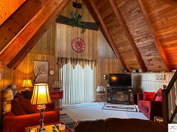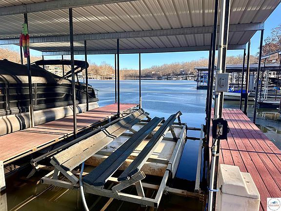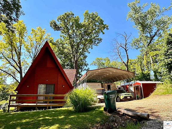 Spend All Year Around In This Charming Log Sided A-Frame with a 10x30 covered boat slip with lift and power on the Lake of the Ozarks. Very roomy master bedroom in the loft with a private deck and outdoor access and 1 1/2 bathrooms. Three large lots with a lake view with room to build an addition to the home or build a garage or workshop. 29' travel trailer stays with home for additional guests with 1 bedroom and 1/2 bath with water and sewer hookups. Large RV Carport with plenty of parking with two metal storage sheds included. Kitchen and bathrooms have been updated with dutch kitchen door to enjoy the back patio. The house has just been repainted and has a new central air conditioner, washer and dryer and new gutters installed. Most furniture stays including paddle boat, lawn mower, electric fireplace and TV. Includes home warranty. Community boat ramp onto the Lake of the Ozarks at the bottom of the hill.