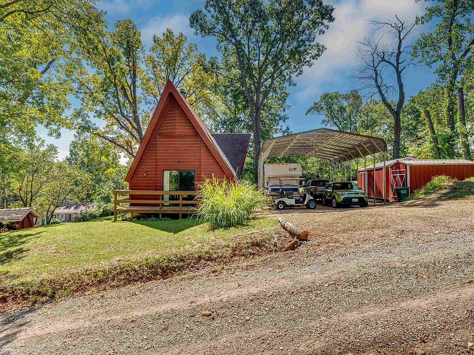 This absolutely charming, lakeview A-frame is just oozing with character and comes furnished with absolutely everything you need to walk in and start full-time or seasonal lake living! It is situated on 3 lots and each lot has water and sewer connections, which would allow for additional vacation home options! In addition to the 3 lots, it comes with an owned boat slip, which has a lift large enough for a 24' boat, and is a short golf cart ride away! The seller has put up a brand new 20x34x14 carport to store your big toys and there are 2 additional sheds to store your smaller toys! The home also has a brand new air conditioner and 200 amp service. 2023-10-11
