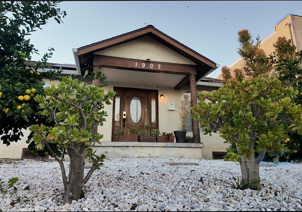 The outdoor spaces offer mature, well-maintained landscaping, including Podocarpus, hibiscus, a lemon tree, a key lime tree, and a pomegranate tree. The property provides one garage parking space, an additional covered parking space, ample street parking, and shared driveway access due to the ADU at the rear of the lot. A side entrance near the primary bedroom offers easy access to the patio area. Additional features include a Nest thermostat, can lighting, a coat closet, double-paned windows, solar panels for energy savings, and an EV-ready setup equipped with a 240V outlet and J1772 charging cord.