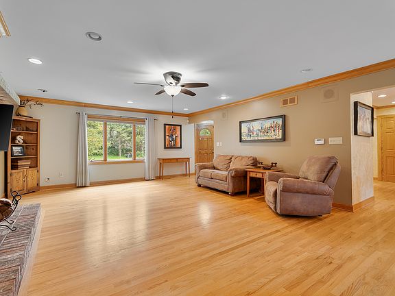 Tucked away on 4.3 acres of wooded privacy, this custom 4-bedroom, 3.5-bath home is a true retreat designed for everyday comfort and unforgettable entertaining. From the moment you step inside, you'll feel the warmth of hardwood floors, crown molding, and rich millwork. The chef's kitchen is a showpiece-granite counters as far as the eye can see, a massive center island, endless cabinets, a pantry, stainless steel appliances, a built-in oven and microwave, and even a copper-hood cooktop. Off the kitchen, the breakfast area flows effortlessly into the great room with a see-through fireplace and the sunroom wrapped in windows, where nature steals the show. Upstairs, the primary suite feels like a getaway with a sitting room, cedar walk-in closet, and spa bath with double sinks and a custom-tiled shower. Three more oversized bedrooms-each with cedar closets-share a beautifully updated full bath. But the real surprise is the Northwoods-inspired lower level. Picture a massive 39x28 rec room with a stone fireplace, copper drop ceiling, and full wet bar that practically begs for gatherings. Add in a full bath and a staircase straight out to the pool, and this space becomes a year-round destination. Step outside and it only gets better-your own resort-style oasis with a sprawling paver patio, a 20x40 in-ground pool, a hot tub and a shaded second patio overlooking acres of peaceful countryside. And here's the most unforgettable feature-your very own chicken house with chickens and ducks, plus two baby goats with their own little home. The best part? They can stay with the property if you'd like! A circular drive, 2-car garage, storage shed, and direct access to Boger Bog Conservation District trails complete the package. And yes-horses are welcome! This isn't just a home. It's a lifestyle-peaceful, private, and perfect for creating memories.