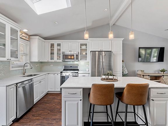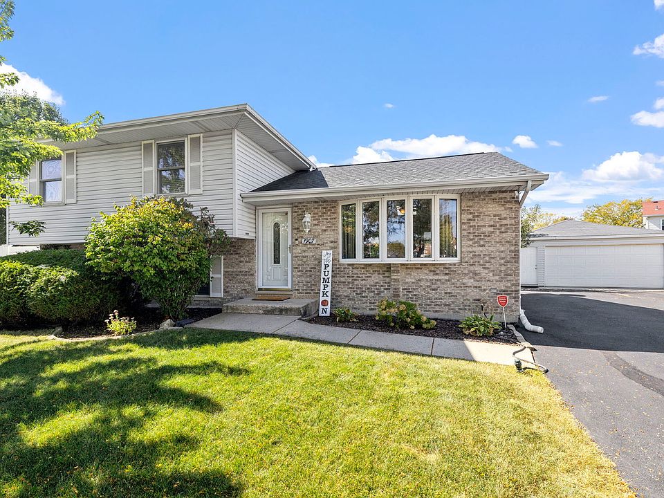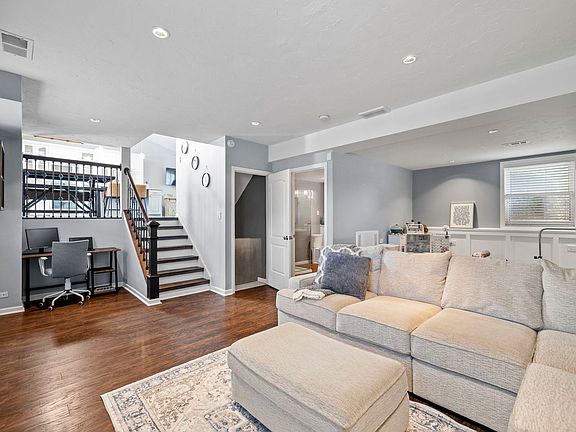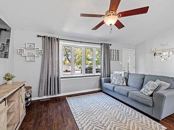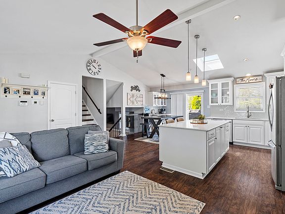 Discover a true Plainfield gem in this exquisite home, meticulously upgraded with top-of-the-line finishes throughout. The living room and kitchen combination creates an open and inviting atmosphere, boasting soaring cathedral ceilings and a charming skylight that bathes the space in natural light. The kitchen is a chef's dream, featuring pristine white cabinetry with convenient slow-close drawers, a large island perfect for meal prep or casual dining, a dedicated beverage center, and elegant quartz countertops. Rich, dark wood-look flooring flows seamlessly through these main living areas, adding a touch of sophistication. The lower level family room is adorned with intricate trimwork, creating a refined ambiance, and includes a dedicated toy area, ensuring space for everyone. Both bathrooms have been completely renovated to the highest standards. One offers a luxurious whirlpool shower and double shower heads, providing a spa-like experience. Comfort is key in all three bedrooms, each equipped with ceiling fans and carpeting. Fresh new blinds adorn every window, offering privacy and style. The finished basement is a true highlight, transformed into a dream entertainment space. It features rustic barn wood accents, a stylish bar, and two televisions that are included with the home, making it perfect for gatherings. The laundry room is functional and beautiful, with a granite countertop folding station. Beyond the interior, the large garage offers the convenience of a gas line for a heater, ensuring comfort during colder months. The outdoor living space is equally impressive, boasting a spacious deck, a refreshing pool, and two sheds for ample storage. A 6-foot privacy fence encloses the yard, creating a secluded oasis.