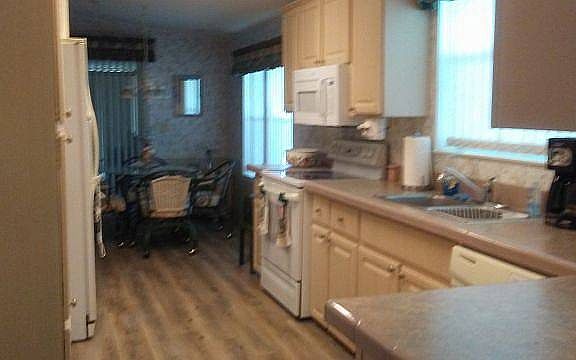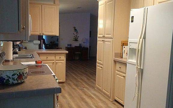 Open concept 2 bed, 2 bath with a large office or 3rd bedroom is situated on a quiet street and features a kitchen with cabinets galore, pantry, newer appliances and breakfast nook. There is an indoor laundry, large living room and dining room. The master bedroom features his and hers closets. The Florida room comes equipped with vinyl windows and air conditioner. There is new carpet in bedrooms and new vinyl planking throughout. The air conditioner was new in September 2018 and roof in September 2017. There is a double carport for plenty of parking and oversized shed with golf cart.