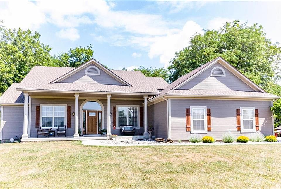 Immaculate reverse 1.5 story on a total of 6 acres, 3 acres being fenced for horses and/or cattle. Updated kitchen with new granite countertops. Tall Ceilings throughout with 2 floor to ceiling stone fireplaces. Stone walkway to newer landscaped outbuilding with front porch, roll-up garage door and fire-pit! Open front outbuilding inside fenced 3 acres. Large stocked pond ready to fish! Home sale includes both parcels. Great location, easy highway access to 50 highway or I-70!