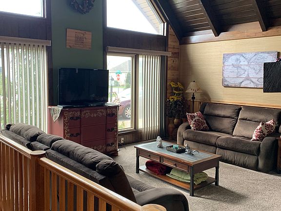 Well cared for corner lot home featuring contemporary architecture in the main part of the house to include vaulted wood ceilings, floor to ceiling stone fireplace and plenty of natural light! Kitchen features granite counters, new sink/faucet, recessed lighting, ceramic tile floors and leads into a 20x20 four season room w/access to the deck or fenced back yard! Master suite to include remodeled bathroom and deck access as well. Partially finished walk-out lower level features garage access, plenty of storage, new water system, rough plumbed for a bath (possible in-law qtrs) and more natural light . With great curb appeal, a circular driveway, fenced yard, plenty of off-street parking, all appliances included, and a home warranty makes this home a must see!