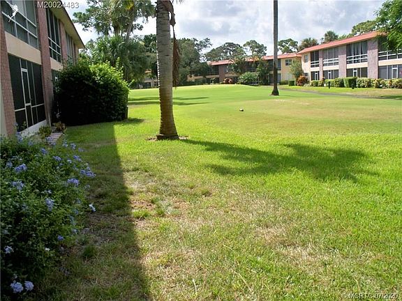 FIRST FLOOR 1 bedroom 1 bath condo with large porch. Some updates include side-by-side refrigerator, stove and microwave. Foyer, kitchen, bathroom and porch tiled. Bathroom with updated toilet and vanity. Bedroom with a walk-in closet and laminate flooring. Living room with laminate flooring. A/C approx 8 years old. Porch overlooks golf course plus has 2 closets for storage. Parking right at the unit with guest parking close too. UNLMITED GOLF. Water, sewer, basic cable, putting green, bocce, library, WIFI at the main clubhouse, 2nd clubhouse on the St Lucie River with 2 fishing piers, storage area for canoe/kayac as available, shuffle board, pool, kitchen, bocce, exercise room