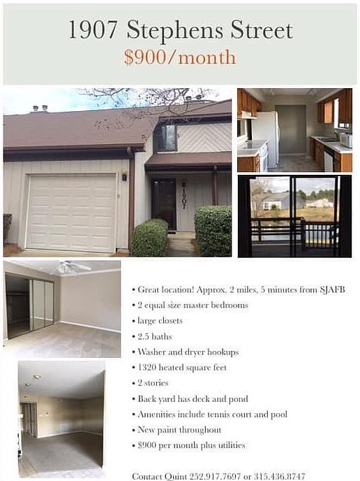 Great location! Approx. 5 minutes from SJAFB. 2 equal size master bedrooms and bathrooms. Washer and dryer hookup. Back yard has deck and pond. Amenities include pool and tennis court. Garage, driveway, and street parking. Wired fir security system and cable. For Rent or Sale! Ask owner for sales price if interested. Owner covers HOA. Tenant responsible for utilities. Small/medium dogs allowed with approval!