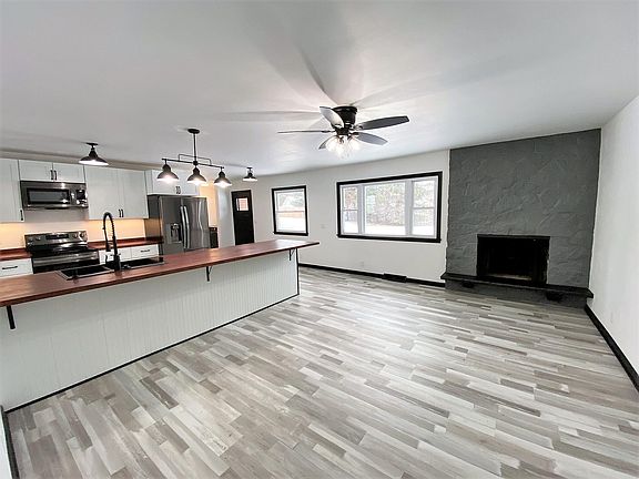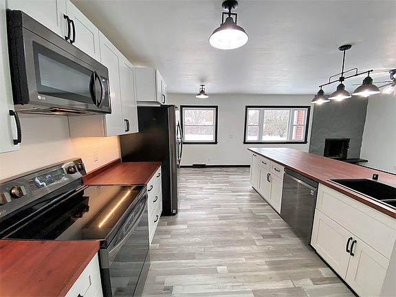 Stunning modernly updated 4BR 2BA red brick split ranch. Gorgeous updated KT w/ counter seating opens to den space w/ NFP and has brand new SS appliances, custom butcher block countertops & soft close cabinets. Bright oversized LR connects to dining rm w/BIC. Master BR has sliding barn door entry to updated bath w/ black granite vanity, step in shower w/ beautiful ceramic tile surround. Breathtaking main bath has white granite vanity top, gorgeous ceramic tile tub surround & floor. 1st floor laundry w/ tile floor and granite counterspace. Walkout from KT to poured concrete patio. Full basement has excellent layout to add rec rm. Brand new fixtures, LED lighting, paint, flooring, carpeting, trim & doors. Complete w/ vinyl tilt in windows, new furnace (2018) & poured concrete driveway (2021)