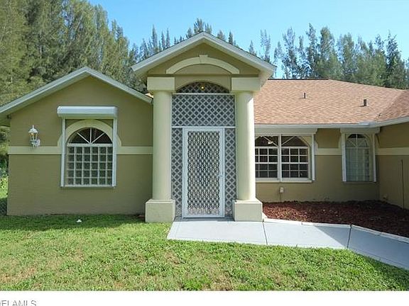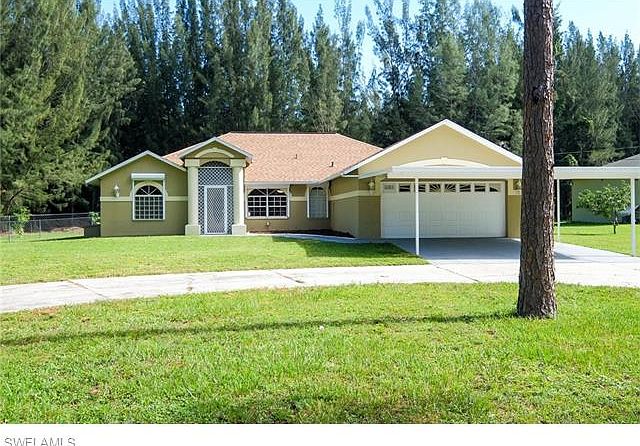 A Contractor's Oasis. Perfect opportunity for someone who wants enough land to park vehicles, an RV or even a boat. Acreage is scarce in Cape Coral. Take advantage of this unique opportunity to own a home and live in it as a residence, yet have the opportunity to convert it to commercial at any time. This 1.19 Acre parcel is zoned Pine Island Corridor. Don't let the year fool you. Within the last year there has been a new roof, AC unit, hot water heater, granite countertops and high-end appliances including a slide in convection oven. All tile throughout. Electric roll down shuters on the entire home. Patio area also has Accordion shutters so you can protect your outside furniture too. Enjoy the tranquility of the wooded backyard view while enjoying your travertine fire pit. Numerous fruit trees and a fenced dog run with shaded area. Front of Property is fenced for privacy. Large concrete circular driveway with extra parking. 2 car attached garage and a 2 car carport. Home shows pride of ownership, is very clean and well maintained.