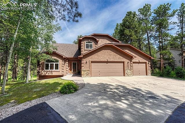 Gorgeous custom home in the desirable area of Woodmoor Forest on a quiet cul-de-sac in Monument. This beauty features 4 bedrooms, 4 baths, 4,593 total sq ft and a main level office. Hardwood flooring welcomes you along with a vaulted formal living room with a large bay window and above loft area. Arches lead you into the formal dining room and the chefs kitchen is wonderful with its center island, a gas cooktop, double wall oven, slab granite counters, a walk-in pantry, a planning desk and large breakfast nook that walks-out to the covered deck with stairs leading to the lower patio. The open great room features a river rock gas fireplace with custom woodwork and beamed ceiling. Completing the main level is an office or could be a 5th bedroom, a laundry room with built-in cabinets, a sink and the entrance to the 3-car garage. The upper level boasts a loft area that overlooks the living room, the master retreat with a gas fireplace, a walk-in closet plus an updated master spa with a jetted tub. Completing the upper level are two additional spacious bedrooms with huge double closets and one having built-in nooks, an updated full size bath with granite countertops and a double sink. The lower level spacious family room features a 3-sided fireplace, a built-in entertainment center, projector, a screen, surround sound and walks-out to the private patio to enjoy the forest and wildlife. Completing the lower level is an additional bright and airy bedroom, a full size bath and the utility room. Home is situated on .64 of an acre and is near The Country Club at Woodmoor and the Kings Deer Golf Course.