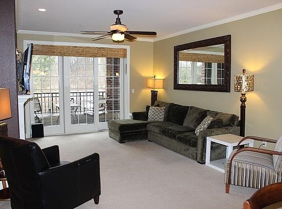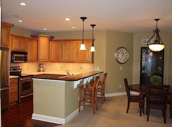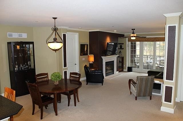 PRIVATE, 2 bed/2 bath + den 1st floor condo w/ 2 assigned parking spots, overlooking manicured ponds & wooded area. Open concept, split bedroom plan w/ 9 ft. ceilings & 8 ft. doors. Kitchen has S/S appliances, maple cabinets, cherry floors, stone backsplash & quartz snack-bar. Great room w/ GFP, custom shelves, & 9ft. patio door leads to balcony. Master bedroom suite has 2 WIC's, in unit laundry & master bath w/ dual sinks, oversized tile shower, whirlpool & private water closet.