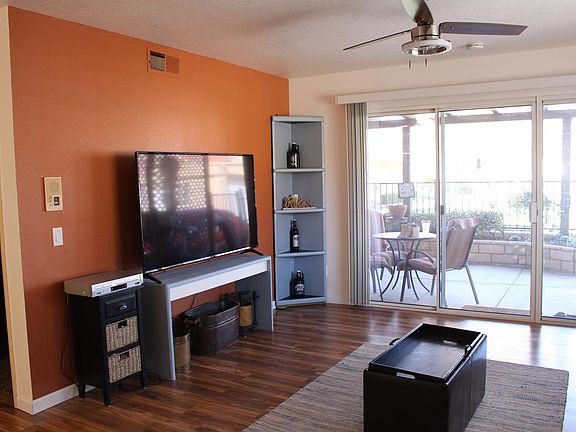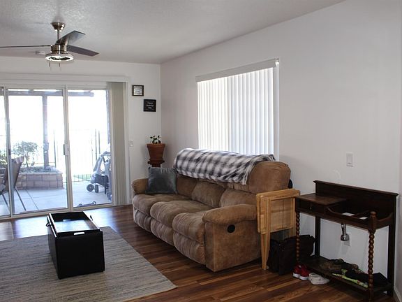 Absolutely beautiful home in Jess Ranch 55+ community. Pride in ownership shows as soon as you walk in. Opening the front door, you walk into the living room with beautiful wood laminate floors. Living room and dining area are one large room. Walking passed the dining area, you have the kitchen on the left. Kitchen features an eat in area, huge windows for lots of lights and appliances that are less than a year old. The spacious guest bedroom is next to the kitchen. It has a large walk in closet and bathroom access. Guest bathroom has laundry inside. Across the dining area is the Primary bedroom. Primary bedroom is very spacious, has a slider to the patio, extra storage, walk in closet, double sink with center vanity and private shower area. Both bedrooms are carpeted. Patio is fully fenced with a gate to the greenbelt behind, it also has a doggie potty area for your fur babies. Home has been completely updated with new paint, floors, baseboards, appliances, fans, and patio fencing all completed within the last year. This home also has a security door on the master slider as well as front door so doors can be left open for fresh air. You will absolutely love this place, it is a corner lot, quiet area, greenbelt/walkway behind you, everything you could want in a home.