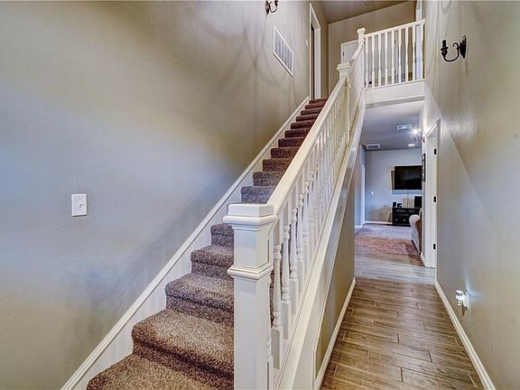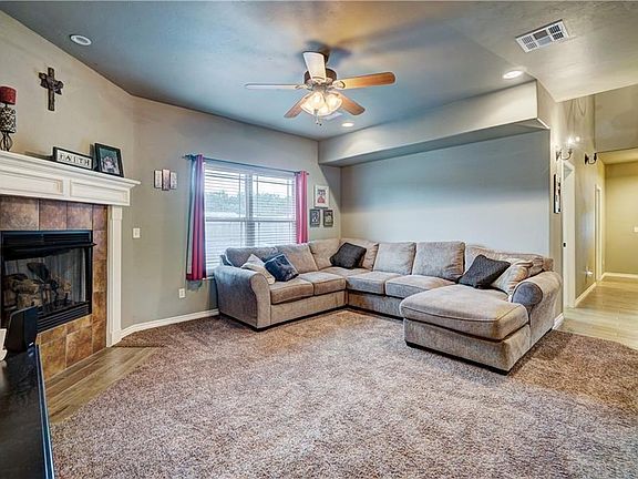Only one owner for this handsome home. Just three years and already charming buyers everywhere. Meticulously maintained, improved upon until perfection was achieved. The Kitchen will leave you awestruck! Granite filled w/loads of cabinets, pull out shelves & a pantry. The kitchen island is a sweet add-on. Along w/a gas range & everything else you've dreamed about. The downstairs Master Suite is perfect w/a luxury spa style bathroom, jetted tub, tile shower, etc. You will relax at the view of the living area, so comfy and cozy with a fireplace. Downstairs also has a half bath & extra large laundry room, and a "flex" room (bedroom, office, second living). Upstairs is 3 very LARGE bedrooms w/walk-in closets, a granite clad bathroom w/double vanities & a built in desk & in the hall, along w/a double linen closet. The garage is nearly 600 square feet w/a storm shelter. A huge yard safely enclosed w/beautiful fencing is great! Dual zone HVAC, energy efficient w/highest electric bill $140.