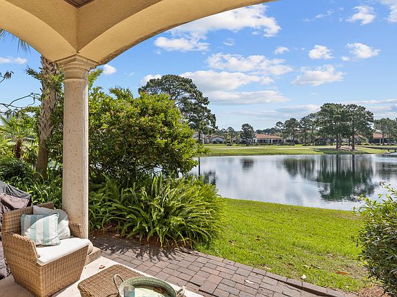 Enjoy Amazing Water Views overlooking the Lake and 4th Fairway of Baytowne Golf Course while relaxing on your back patio or upstairs Primary Bedroom Balcony. Located in the desirable neighborhood of Villa Lago with neighborhood Pool and Club House, this Mediterranean Style Home includes a Golf Cart. As a Primary Residence, Vacation Retreat or Investment Property, the Open Floorplan allows for Spacious Living and Dining, perfect for entertaining and living the Resort Lifestyle. Beautifully designed with a Warm & Coastal Flair, this home offers Travertine Flooring throughout the Main Living & Baths, Granite Counters, Stainless Appl, Triple Crown Molding, Extra Pavers extending the Back Patio, an Oversiized One Car Garage, Lots of Closet Space and Extra Pavers in the Driveway for addt'l cars