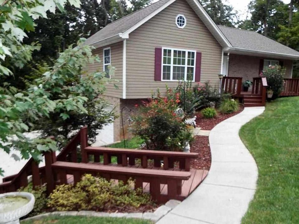 You're going to love this one! Looking for privacy close to everything? You found it! This beautiful home offers roomy bedrooms and two full baths. Vaulted ceiling through the kitchen and living room and a dining area that opens directly onto your upper level deck. Freshly painted,new gutters with caps, 2 year old heat pump and an outbuilding that makes the perfect workshop. But there's more! The basement has a finished area and a huge two car garage! Make your appointment to see it today!