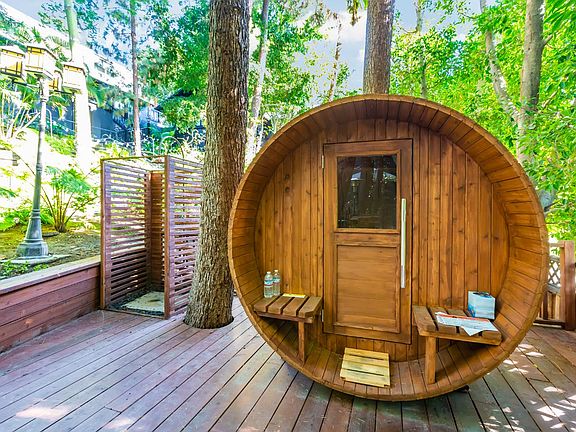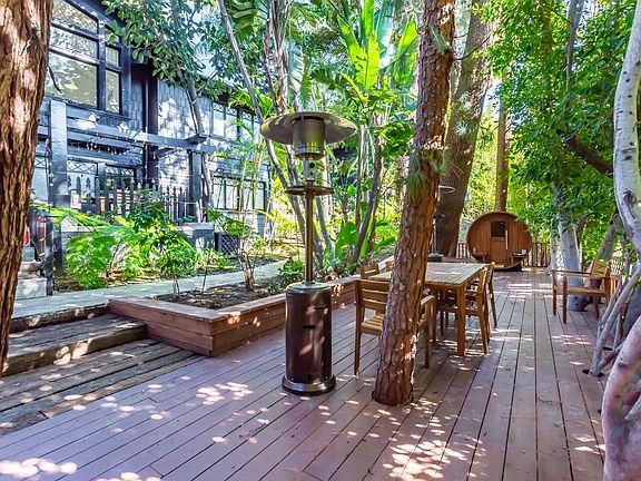 Bali Jungle Home, in the heart of Hollywood Hills West, is a modern craftsman bungalow surrounded by a lush garden courtyard, tall trees, and a large deck with breathtaking views in a 6-unit building, With the added amenities of a sauna and cold shower, this property offers a serene retreat. Step onto the expansive front porch to be greeted by stunning 2 master suites, hardwood floors, crown molding, a fireplace, abundant natural light, and closets. Enjoy its private outdoor patio and a spacious front porch for al fresco dining. The gated building includes a 1-car garage, new stainless-steel appliances, central A/C & heating, and a washer/dryer. The street has ample space for additional cars. FIRST SHOWING FRIDAY 21st at 11:00 AM BY APPOINTMENT ONLY Minimum lease term: 12 months