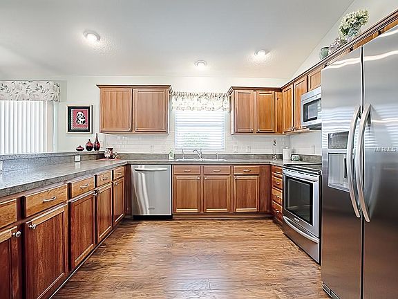 STUNNING 3/2 FOXGLOVE COURTYARD VILLA in the Village of ST. JAMES. Beautiful curb appeal w/LOW MAINTENANCE yard w/stack rock walls, rockery, palms and shrubs. Lovely entrance with painted front porch and storm door! Once inside, straight ahead is the lovely kitchen w/Light CHERRY cabinets w/crown molding, hardware & pull-outs, HI DEFINITION LAMINATE counter tops, SUBWAY TILE back splash, closet pantry and updgraded KitchenAid appliances w/ smooth-top electric range and side-by-side refrigerator! Beautiful LAMINATE WOOD flooring has been added throughout the entire home! Across from the 3rd bedroom is the INSIDE LAUNDRY which was completely redone w/FRONT LOAD WASHER/DRYER, upper and lower custom cabinets, stainless built-in sink and counter top to match the kitchen! Left of the foyer is the SPACIOUS, OPEN dining /living room w/custom cornices and sliding glass doors out to the lanai and the side patio with painted walkway around entire villa. There are upgraded fans and light fixtures throughout. A pocket door leads to the second guest bedroom and guest bath where tile was added all the way to the ceiling in the tub/shower! The master bedroom has a TRAY CEILING, large walk-in closet, custom window treatments, sliding glass doors out to the lanai and en suite bathroom with w/RAIN GLASS shower door. Lovely decor colors throughout! The exterior of the home was recently painted and there is a whole house water conditioning system! This is AN IMMACULATE WELL MAINTAINED HOME! Great LOCATION!!