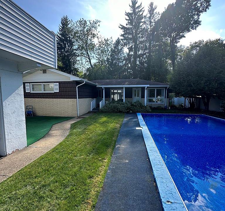 Unique ranch home. This hidden gem features in ground pool, covered porch, large 2 car garage with front and back garage doors, living room with doors leading to the pool area, large family room, dining room with access to back deck and kitchen. Fenced in private flat yard perfect for entertaining. Lower level has rec room, 2nd full bath, laundry area and cedar lined closet.