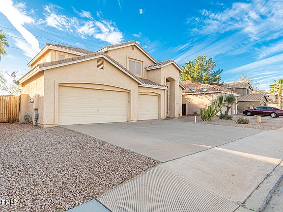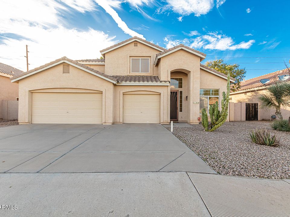 This remarkable home will surely impress you! Discover the beauty of this two-story residence boasting a desert front yard & a 3-car garage. The inviting interior highlights spacious living areas complemented w/soaring vaulted ceilings, decorative light fixtures, picture-perfect windows, & sleek wood-style flooring. The heart of this home is the gourmet kitchen, including granite counters, rich wood shaker cabinetry, a pantry, SS appliances, an island w/a breakfast bar, & a breakfast nook w/a bay window. Retreat to the main bedroom upstairs, featuring a designer's paint, an ensuite w/dual sinks, a glass shower, & a walk-in closet. Enjoy alfresco dining under the covered patio, play on the verdant lawn, or plunge into the refreshing pool in the vast backyard! This gem will not disappoint!