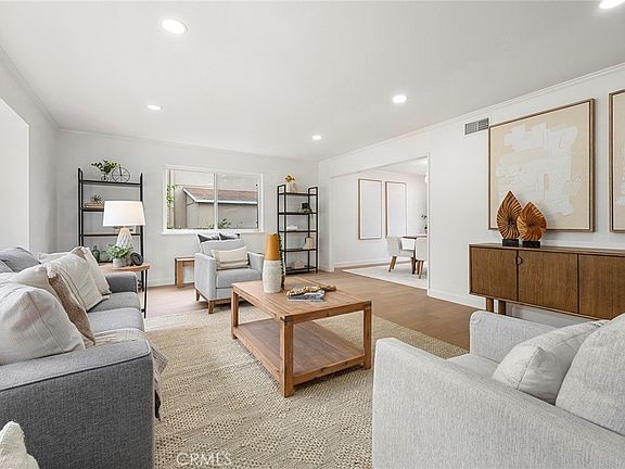 Step inside to discover an open-concept living area flooded with natural light, featuring brand-new engineered hardwood flooring, recessed lighting, and a sleek, custom designer kitchen complete with stainless steel appliances, marble countertops, and a large center peninsula. The spacious living and dining areas flow seamlessly, making it easy to host gatherings or enjoy quiet nights at home. The dining room is generously lit by recessed lighting and a brass CB2 chandelier. The primary suite is a true retreat, offering a spacious closet and a beautifully updated en-suite bathroom with a marble vanity and a luxurious walk-in shower. Two additional bedrooms are generously sized and share a stylishly remodeled full bathroom with a dual marble vanity. Additionally, you will find a lovely half bathroom in the family room next to the dry bar. Step outside to the newly landscaped backyard—ideal for BBQs, outdoor dining, or simply enjoying the California sunshine. The home features a brand new air conditioning system. Enjoy a two-car garage with plenty of storage and brand new driveway. Located in Fullerton, just minutes from top-rated schools, shopping, dining, and parks, this home offers the best of suburban living with easy access to all that Orange County has to offer. Don’t miss this rare opportunity to own a turnkey home in the prestigious Sunset Lane neighborhood!