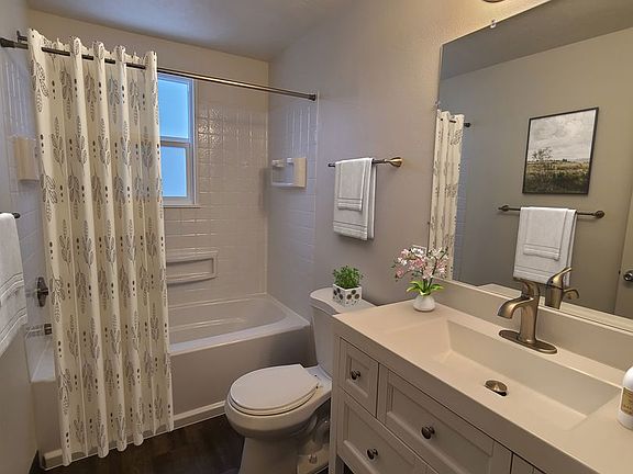Modern white vanityLarge windowsConnected dining roomLaminate flooringNewer wood cabinetsOpen layout