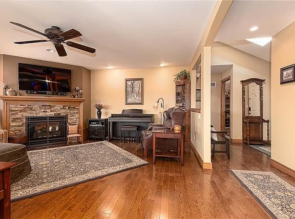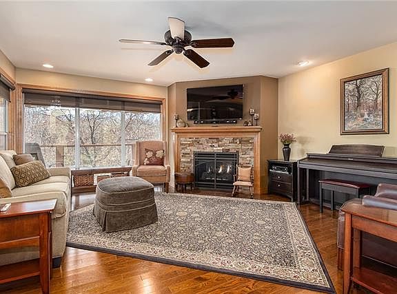 Luxury main level living on The Jayhawk Club course. Beautifully updated & well maintained with clear views of the fairway, theprofessionally landscaped yard & the amazing sunsets. Lvg/Din Rm windows replaced w/ high impact, efficient thermal glass & dressedwith light filtering, UV rated solar shades. Heatilator FP, heated primary bath floor, Cambia quartz counters, Mirage brand hardwoodfloors. Walkout basement. No hoa fees. Shared wall in garage only. Open concept yet cozy & perfect for entertaining!