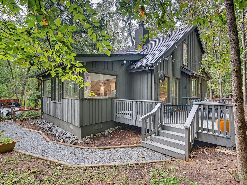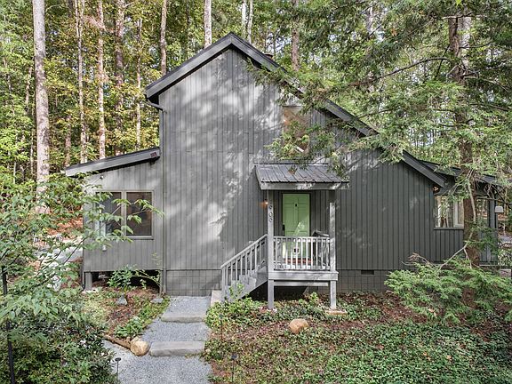 Tucked in a quiet setting just 10 minutes into Carrboro and Chapel Hill, this woodland modern gem has all the cozy vibes you want this Fall! Full of MCM character, the lofted living room with large skylights is anchored by dramatic stone wood-burning fireplace (functional, and keeps things toasty!). Walls of windows let dappled sunlight spill in on all sides. Enjoy peaceful wooded vistas from the showstopper sunroom. Live up soup season in the large, updated kitchen with new appliances, solid wood cabinets and handsome granite. Indoor living spaces welcome you outside to the expansive deck, overlooking private yard and two small ponds! Lush and tree filled, with plenty of open space for gardening and romping in the yard. Serene main-level primary suite with updated bath and double closets to fit all your sweaters. Upstairs bedroom will wow you with custom built-ins that roll back to reveal hideaway Murphy bed, for a multi-functional guest room and home office. Lovely Jack & Jill bathroom connects to third bedroom. So much good character, without the home projects—there are new systems throughout, like new metal roof (2022), efficient heat pump + ductwork (2023), whole-house water filtration (2022), updated electrical panel (2022) and smart Philips Hue lighting. This home welcomes you in like a warm hug. Your perfect Autumn evenings are waiting!