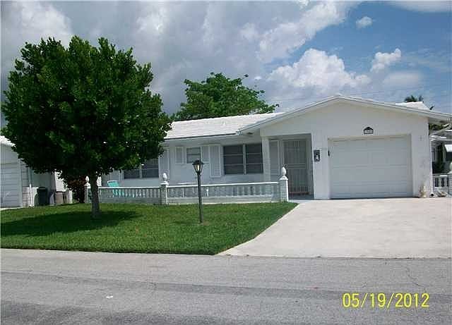 VERY CUTE 2/2/1 REGIS MOD Very cute 2/2/1 Regis Model with Updated Kitchen Cabinets and appliances. Florida room with enclosed Porch. ReRoof 92, Flat Roof 96 and Enclosed Porch 04. Walking distance to Clubhouse, Pool and Golf. Pet friendly large dogs allowed. PAID REC LEASE. SOLD AS IS $124,900 CALL IRENE MISKA 561-523-4531