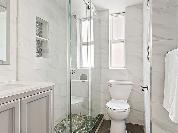 This sun-filled unit features a large living room, new windows, an updated, windowed, eat-in kitchen showcasing stainless steel appliances and a subway tile backsplash, and a renovated bathroom with custom tile.