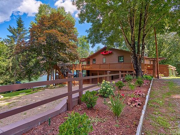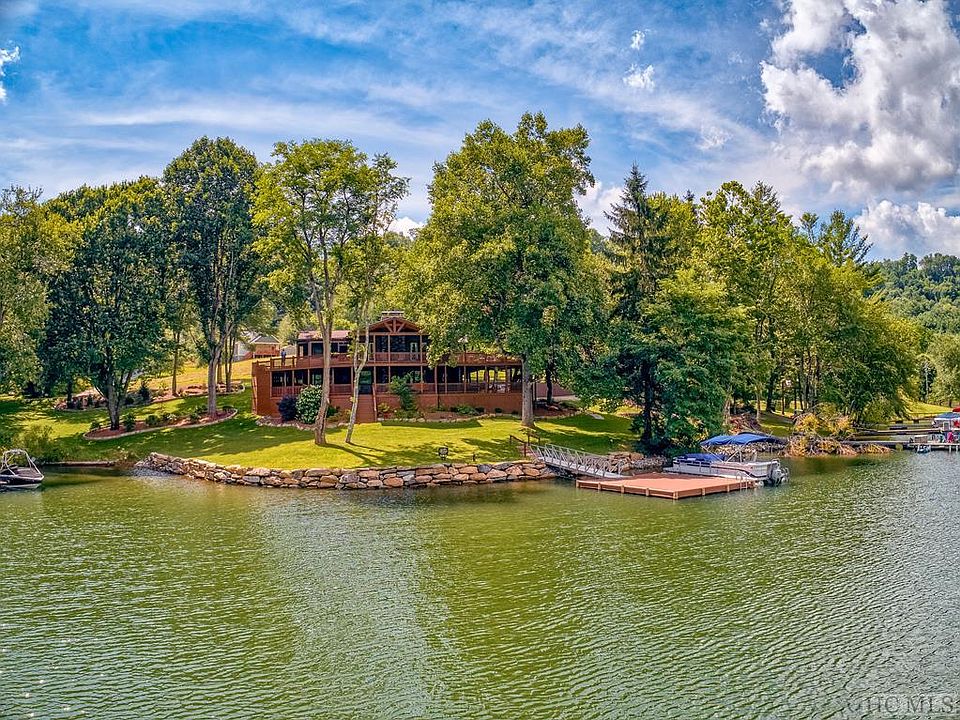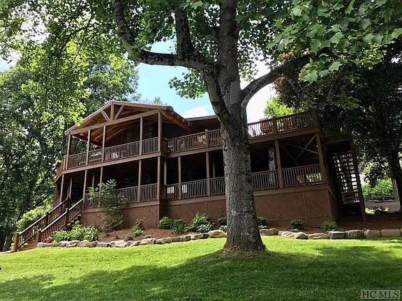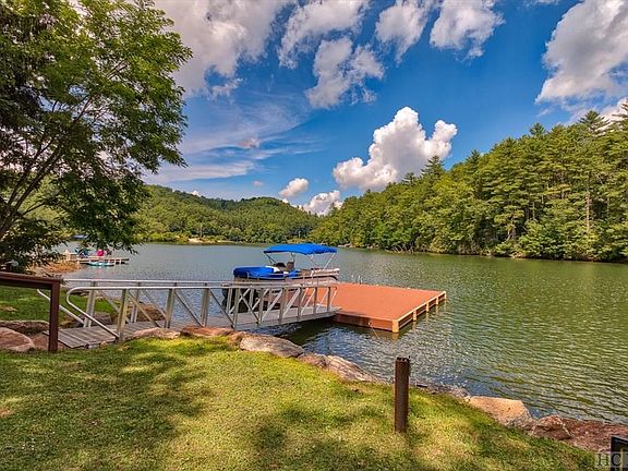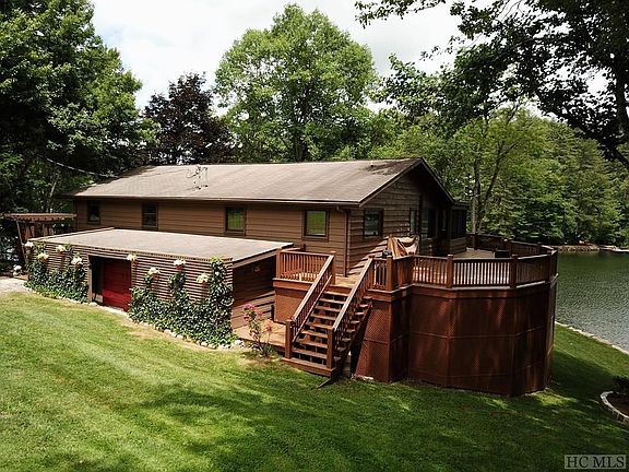 Expansive premier lakefront home on Lake Glenville. 300 feet of seawall lake frontage with panoramic lake/mountain views, multi-car parking areas, and attractive landscaping. Possibly the easiest walk from home to dock on the lake. Large two level deck can accommodate a large number of family and guests, there's a fire pit for gatherings on cool lake evenings, and the private dock is the largest permissible on Lake Glenville. The dock has splinter free, color fast Trex decking, and an aluminum walkway for minimal maintenance. The main level greatroom is an open floor plan with cathedral ceiling, stone fireplace, and oversized windows to bring the beautiful views inside. The main dining, just off the kitchen, is adjacent to additional screened-in outside dining. The completely updated chef's kitchen includes new granite countertops, new cabinets, LED lighting, and all professional Viking appliances, including a six-burner range. The master and guest bedrooms, two flex rooms, and laundry space are on the main level, which has two full updated tile and granite baths. Top down shades allow natural light while preserving privacy. Downstairs is a full living suite, with kitchen and appliances, game room with three-way table, guest bedroom and full bath, and family room with window seats and theater sound, all opening to a covered deck with swing, seating, and access to the dock. Topping all this off is a two car garage with workbench, lockable tool storage, and an overhead secured storage space. Additionally, there are two lighted exterior storage sheds with power outlets. Sold completely furnished, with rooftop Direct TV receiver and dedicated entertainment system. Broadband internet service is through a local proprietary provider. One mile to Arrowhead Stables, 1.5 miles to Duke Power's sand beach and protected swimming. Exceptional rental history available on request.