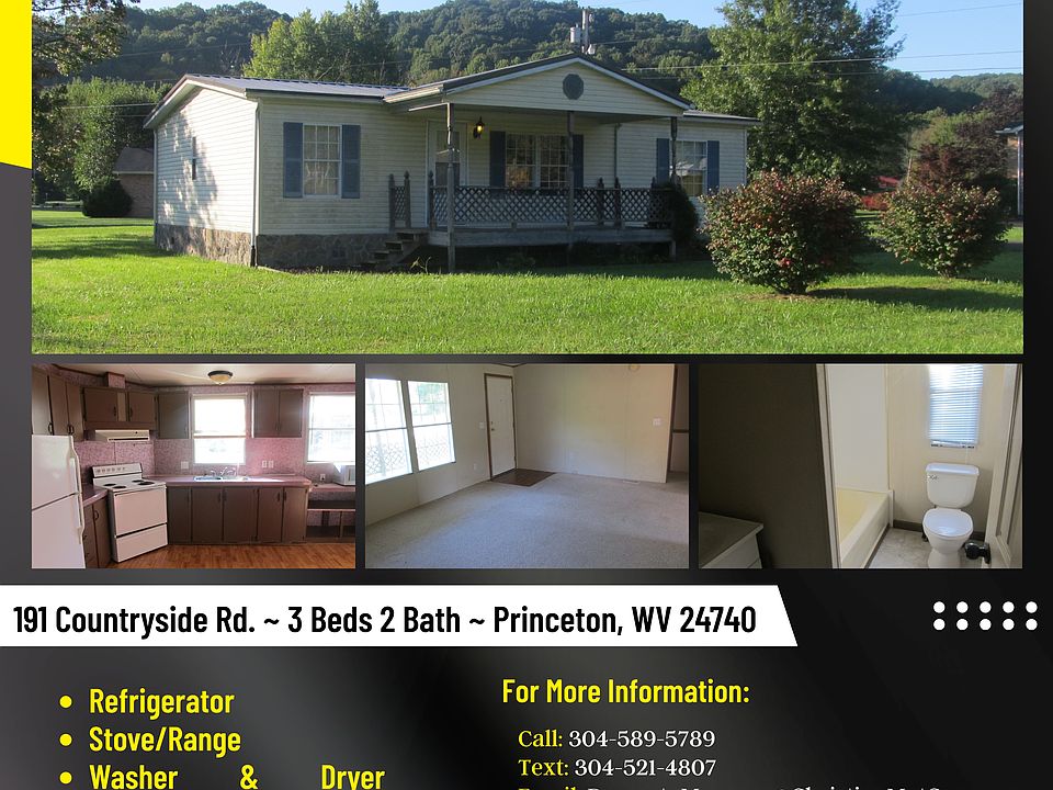 191 Countryside Rd. ~ 3 Beds 2 Bath ~ Princeton, WV 24740 LEASE OPTION ONLY(Path to Home Ownership): Initial payment: $3,500 with no payments due until the 1st of the following month! Monthly payment: $1,150/month. No utilities included. Sorry, this home is not HUD approved. This home features a 3 bedroom, 2 bath floor plan, with spacious rooms. Covered Front and Back Porch. Back porch has an industrial design with a locking gate. Also has a beautiful view of the WV mountains. Washer & Dryer is included, Heat Pump, lava rock landscaping around the perimeter of the home. This home also includes a shed in the rear of the home, with a large driveway. This home is a must see in person! Christian Management Corporation Office Hours: Mon-Fri 9:00AM-5:00PM & 10:00AM-2:00PM the 1st Saturday of every month You can view THIS property 7 days a week! Most pets welcome with a $300.00 pet fee per pet and signed pet agreement. Maximum 2 pets. No aggressive breeds due to insurance restrictions. Clean, safe, quiet, crime & drug-free are our priorities for our residents! We support Equal-Housing Opportunities! Good people with good, bad, low, or no credit but stable employment or Social Security are welcome. -MUST pass background check -NO evictions in the last 7 years -NO sex offenders Is this property not what you are looking for? View our other available #homes, #mobilehomes, #apartments, and more on our Facebook or our website!