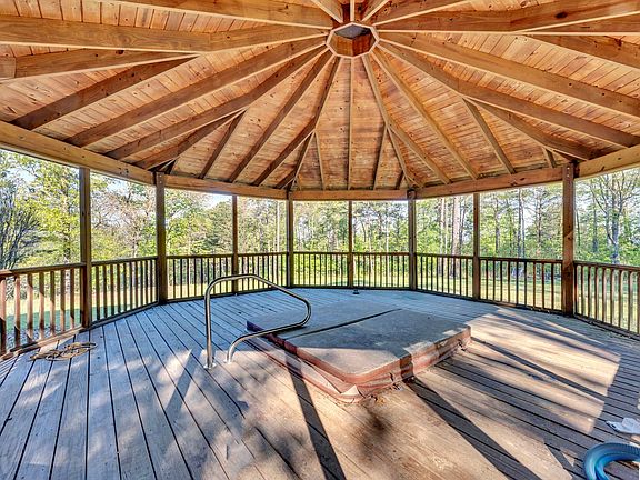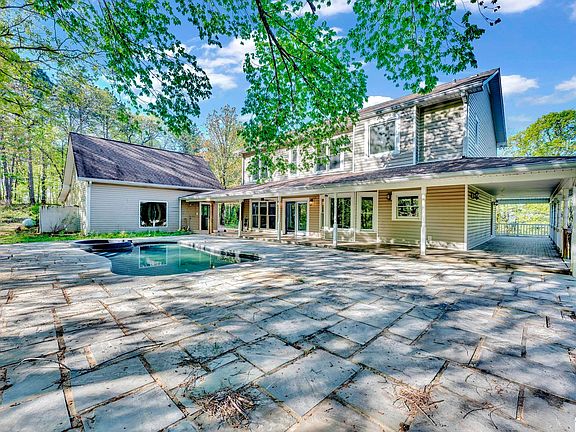 Completely updated and situated on over 14 acres for optimal privacy, this property boasts a brand new salt water pool, a huge gazebo, and a wrap-around porch. The interior of the home has been renovated from top to bottom with beautiful medium brown hardwood floors, light walls, elegant trim, wood posts with metal horizontal railing, and updated lighting fixtures. A spacious foyer greets you upon entering the home, leading to a versatile room that can serve as an office, study, or other flexible space. To the of the foyer, a dining room opens to the gorgeous kitchen featuring white cabinets, granite counter tops, a glass tile back splash, and grey brick surrounding the stove top, complete with a pot filler for added convenience. The kitchen flows into the living room, which boasts a cozy wood-burning fireplace. Upstairs, all bedrooms feature updated details, with an updated hall bath. The detached garage offers newly finished living space that can be used anyway you can imagine!