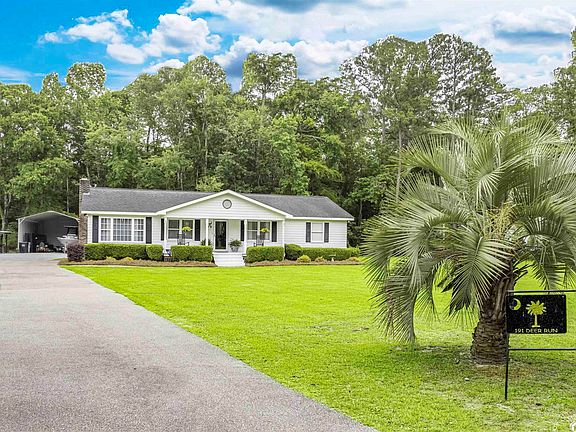 Let's check the boxes: Are you looking for no HOA, large lot, outside city limits, boat storage, workshop, party shed, outdoor spaces? Hmmm...191 Deer Run Loop in Waterway Estates may just be the place for you! Easy floor plan with three bedrooms and two baths - very cute ranch style home with tons of character situated on a spacious one acre lot - this is a great little neighborhood on the very southern end of Georgetown - custom homes, relaxed vibe and room to roam. The brick pathway leads up to the big covered porch overlooking the front yard, perfect for rocking and watching the lightening bugs at night. Upon entry, you'll be pleasantly surprised by how open the space is - large dining and kitchen space with pecky cypress wrapped beams and a sunken great room with brick fireplace (ventless gas logs recently installed) flanked by a white washed low country cypress accent wall. The huge kitchen has stainless appliances, tile back splash, plenty of room for an island addition, and a large laundry room / pantry conveniently located off of the kitchen and providng lots of extra storage space. New luxury vinyl floors throughout the home along with new canned lighting, fixtures, ceiling fans, toilets, and new shower in guest bathroom. Outside there is a covered brick patio, fenced yard area, 30 x 20 metal building, workshop/shed, and a cool outdoor covered cooking / entertaining building with a built in custom bar - perfect place for oysters and football season! The neighborhood is located close to historic Georgetown waterfront Harbor Walk, shopping, wonderful restaurants and fresh seafood vendors. For those who want to be on the water - South Island boat launch is just around the corner for quick entry into the Waterway, jetties, North Inlet, saltwater fishing and access to five rivers that surround the area. Situated on the south side of Georgetown and approximately 45 minutes south to Mount Pleasant - a quiet drive towards Charleston - easy commute to and from work, and 20 miles to Pawleys Island beaches. *Buyer responsible for verifying home and lot square footage.