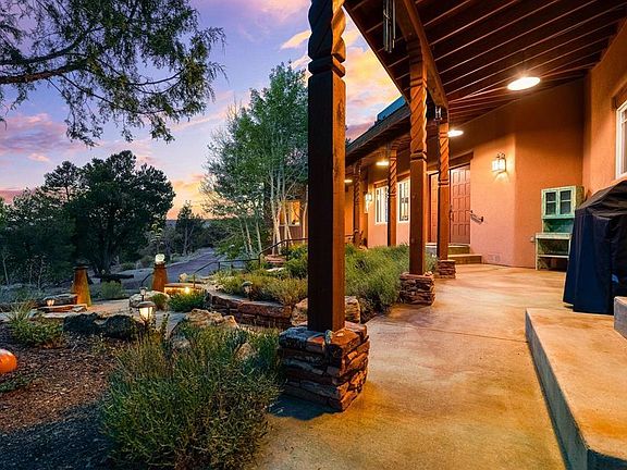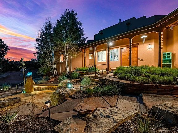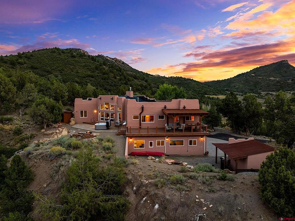 Perched on 22.19 acres with unobstructed, sweeping views of the La Plata Mountains, this 3,561 sq. ft. custom residence offers the rare balance of privacy, artistry, and modern comfort. From the moment you arrive, the thoughtfully landscaped grounds with custom outdoor metalwork by Durango artisan Jeff Wise, hand-crafted details, and warm Southwestern architecture make it clear this is a truly special property. The 3027 main level is designed for both everyday living and entertaining, with expansive windows framing the mountains as the backdrop to the open-concept living, dining, and kitchen areas. A gas fireplace with a carved mantle anchors the great room, complemented by hand-hewn Hickory wide-plank flooring, art niches, and custom plaster accent wall and fireplace. The dining area features a striking new contemporary chandelier and access to the backyard, where the sellers recently added a covered deck and new railing, and hot tub. A stone-bench fire pit perfect setting for evening gatherings under the stars. The kitchen is a chef’s dream, with a massive island, pantry, and upgrades including granite countertops, backsplash, new sinks, and floating shelves. Stainless appliances, a Dacor gas cooktop, and double ovens make this space as functional as it is beautiful. The main level is thoughtfully divided for comfort and privacy. Off the kitchen are two spacious guest bedrooms, each with blackout shades, that share a Jack-and-Jill bathroom featuring Onyx tile, a soaking tub, a walk-in shower, hand-forged lighting, and a dramatic underlit Onyx sink. A cozy family room nearby provides the perfect spot for TV, games, or relaxation with access to the outdoors. On the opposite side of the home, behind the great room, is the private primary suite with direct patio access, stunning mountain views, dual closets, blackout shades, double sinks, a jetted tub, and a walk-in shower with custom tile work. Down the hall, you’ll also find the powder room with a custom copper sink, along with the office/library highlighted by a hand-carved bookcase and wide-plank wood floors. Additional recent upgrades extend to mini-split systems for air conditioning and heating in the bedrooms and living room, fresh interior paint, new garage doors, and blackout window coverings. The in-floor radiant heating system heats the main level, while downstairs features hot water baseboards. On the lower level, discover over 1,000 sq. ft. of versatile space: a two-car garage with in-floor radiant heating, a heated pottery/craft studio, a workshop, and a utility room. An additional 534 sq. ft. gym with hardwood floors underneath the rubber mats and an infrared sauna (included) is accessed from the exterior, offering a retreat for health and wellness. The gym could be also a great office or art studio. The outdoor spaces are a showpiece of their own, blending natural rock work, iron accents, and xeriscaping. An artistic 160 sq. ft. garden shed with handcrafted doors, carved wood posts, and a covered porch adds charm while providing practical storage. Every detail of this residence reflects the influence of fine artistry and craftsmanship. Inspired by Nicolai Fechin and the Taos Builders, and realized with heirloom-quality pieces by the Ernest Thompson Company, the home is both functional and a work of art. Whether hosting friends, pursuing creative passions, or simply soaking in the ever-changing panorama of the La Plata Mountains, this Trappers Crossing estate offers a lifestyle of serenity and inspiration just minutes from downtown Durango.